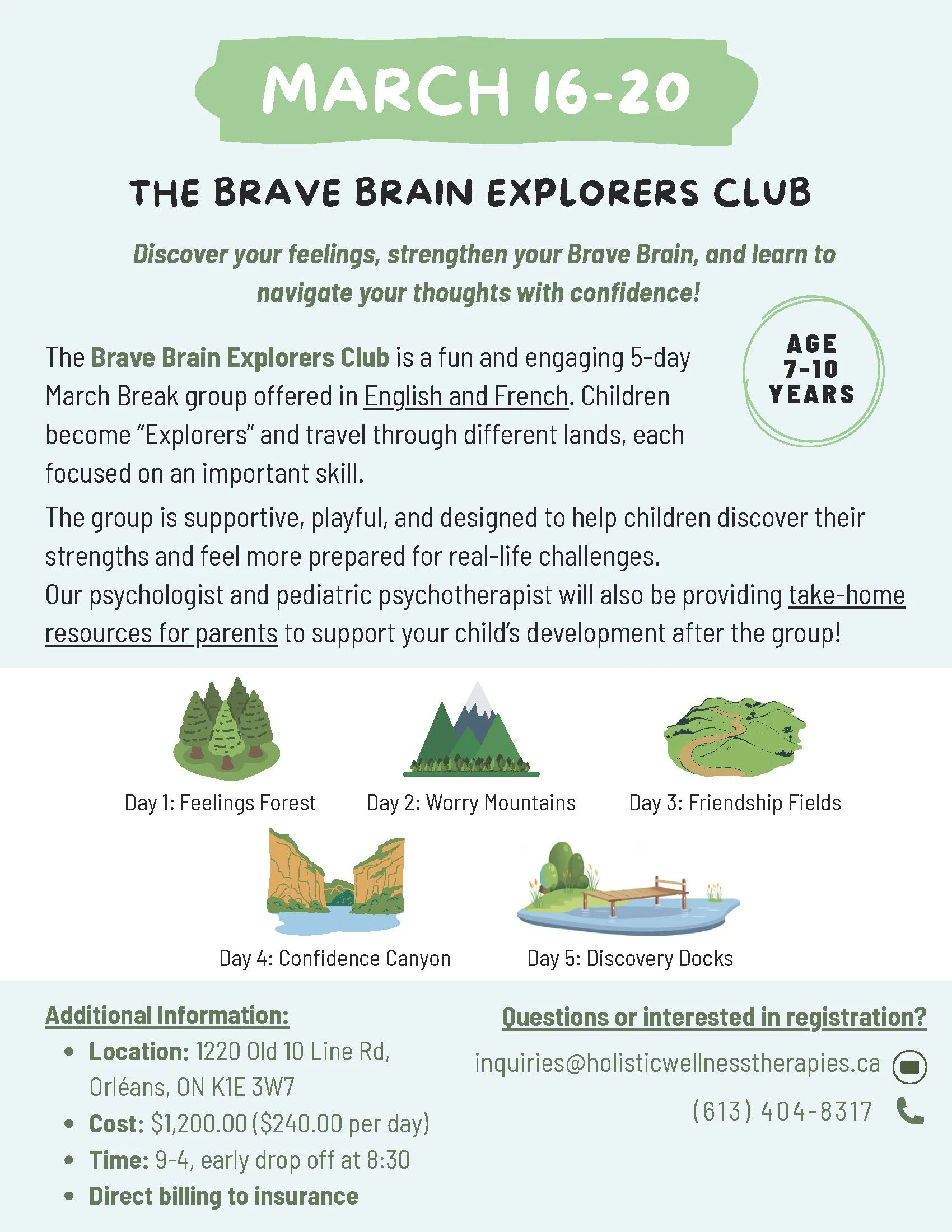 The Brave Brain Explorers Club is a fun and engaging 5-day March Break group offered in English and French. Children become “Explorers” and travel through different lands, each focused on an important skill.